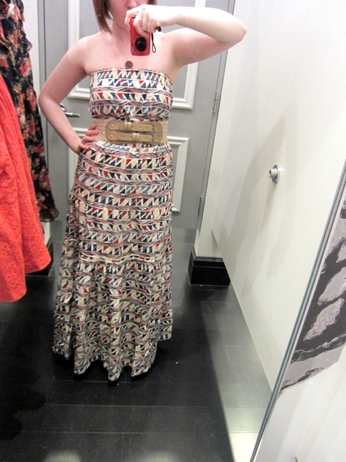 Geometric patterned maxi dress. Looked horrible without the belt. Pretty pattern and length though. $35.80 CAD I think?